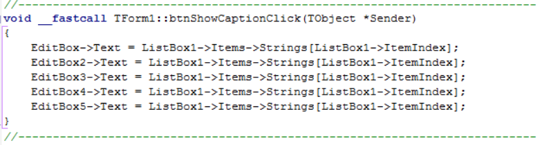 EditBox->Text = ListBox1->Items->Strings[ListBox1->ItemIndex]; - 이 문에서 리스트 박스의 여러개
