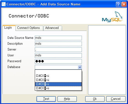 mysql ODBC5.0을 설치후 setup 하는데...DB Name이 깨져나옵니다.