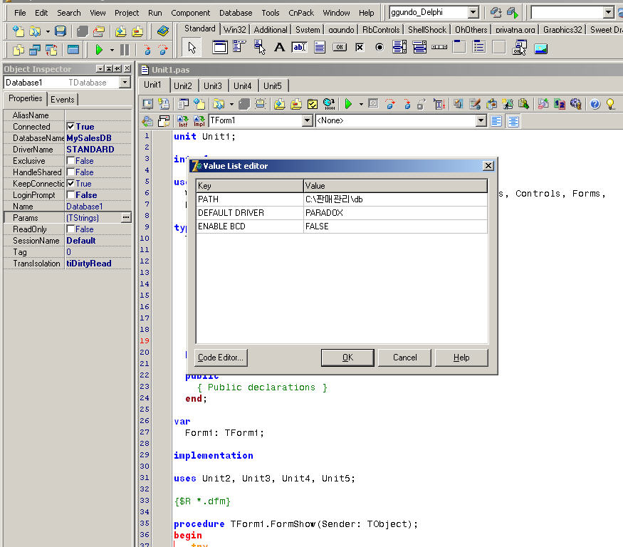 Unit1에 Database라는 non비주얼 컴포넌트에서 Properties에 Param 에 ... 되있는부분