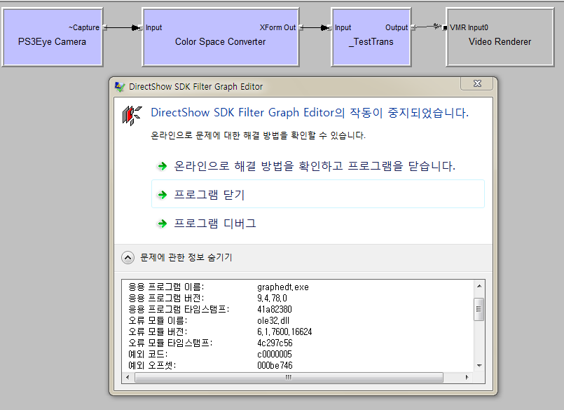 Video Renderer만 연결하면 첨부 스샷의 에러가 뜨면서 Graphedit가 종료됩니다..