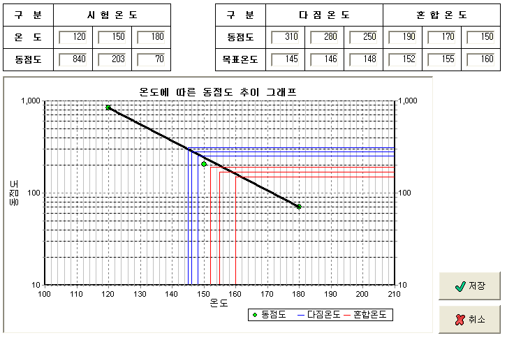 다짐온도와 혼합온도의 동점도 값들을 입력하면 그에 따른 목표온도값들이 나와주어야 합니다...