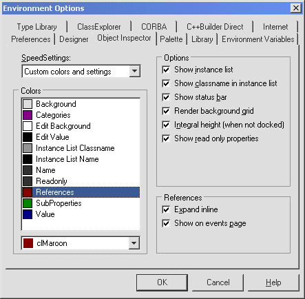 [Environment Options]에서 다른 속성 카테고리들의 색깔을 지정할 수 있습니다.