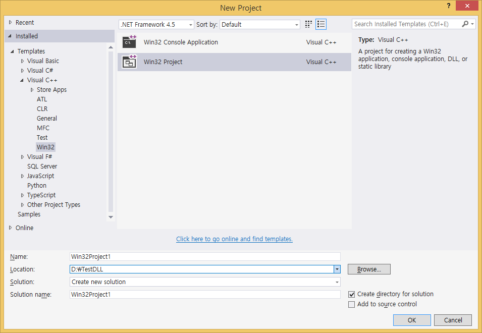 [파일] -> [New] -> [Project] -> [Visual C++] -> [Win32 Project]선택 후 프로젝트명과 솔루션명 입력 후 [OK]