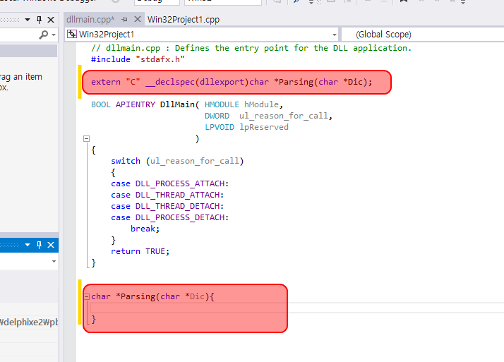 이유는 사용자 함수를 dllmain.cpp에 넣어 주어야 델파이에서 호출이 되는데