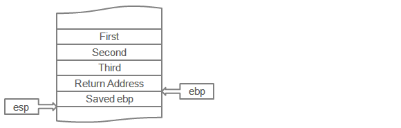 컴파일러가 생성한 엔트리 코드(1장 참고)는 ebp의 현재 값을 저장해두며, 다음으로 esp의 값을 ebp에 복사하므로 ebp를 스택 프레임의 파라미터 데이터를 액세스하는 목적으로 사용할 수 있습니다: