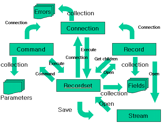 훨씬 간단한 객체모델을 가지며 OLEDB의 복잡함을 감추고 기능들만을 노출시킨 일종의 래퍼(wrapper)라 할 수 있다.