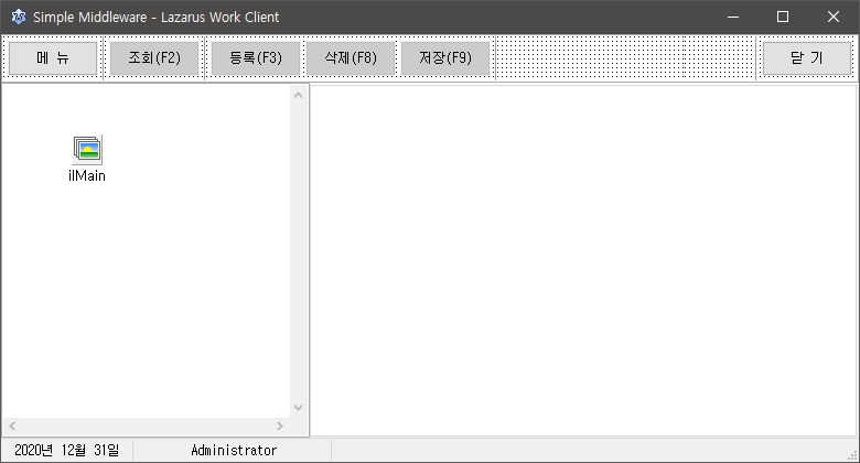 메인 화면의 메뉴는 TMainMenu가 아닌 TTreeView를 사용한 Tree 형태의 메뉴를 사용하고, Popup이 아닌 폼에서 공통으로 사용할 조회/등록/삭제/저장 버튼을 상단에 배치한다. 하단에는 상태바에 현재 날짜와 접속한 사용자명을 보여준다.