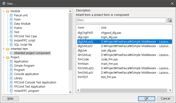 사용자 관리용 폼을 앞에서 만든 부모폼을 상속해서 만들어 보자. New메뉴에서 Inherited Item에 있는 Inherited project component에서 등록용 팝업 부모폼을 선택한 후 OK 버튼을 클릭한다.